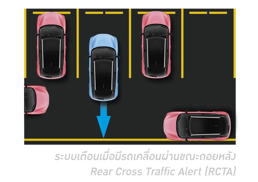 - ระบบเตือนเมื่อมีรถเคลื่อนผ่านขณะถอยหลัง Rear Cross Traffic Alert (RCTA)