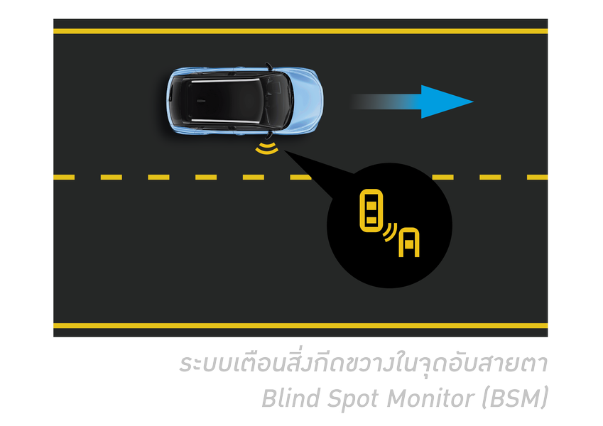 - ระบบเตือนสิ่งกีดขวางในจุดอับสายตา Blind Spot Monitor (BSM)