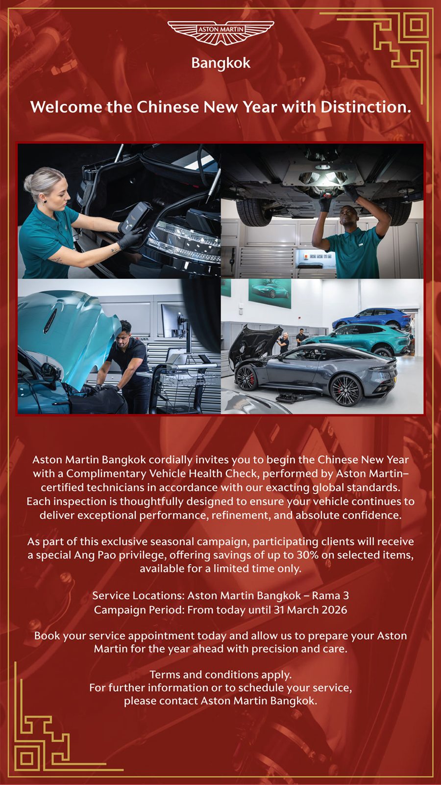 ขณะที่ตรุษจีนปีนี้ แอสตัน มาร์ติน แบงคอก ขอมอบบริการตรวจเช็กสภาพรถ ฟรี ฉลองปีม้าไฟ ให้ลูกค้าได้ขับ แอสตัน มาร์ติน ด้วยความมั่นใจและสมรรถนะสูงสุด พร้อมรับอั่งเปาส่วนลดสูงสุด 30% สำหรับสินค้าที่ร่วมรายการ วันนี้ ถึง 31 มีนาคม 2569 ที่โชว์รูม พร้อมศูนย์บริการครบวงจร แอสตัน มาร์ติน แบงคอก ทุกสาขา