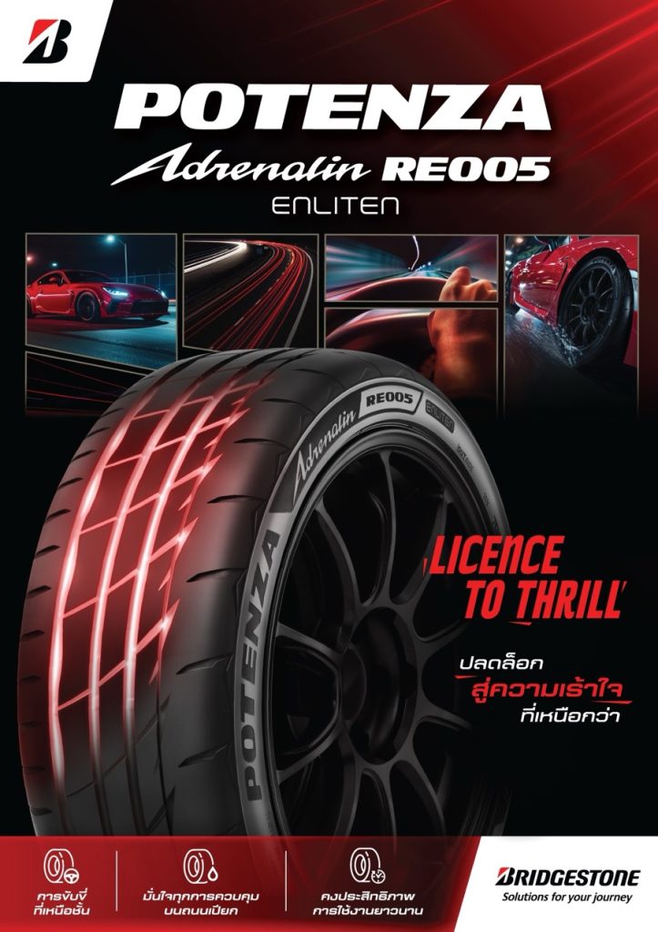 บริษัท บริดจสโตนเซลส์ (ประเทศไทย) จำกัด เปิดตัวผลิตภัณฑ์ยางรถยนต์สปอร์ตพรีเมียมรุ่นใหม่ล่าสุด“BRIDGESTONE POTENZA Adrenalin RE005” ภายใต้คอนเซปต์ “ปลดล็อกสู่ความเร้าใจที่เหนือกว่า”พร้อมให้คุณปลดปล่อยพลังความสปอร์ตเต็มพิกัด ควบคุมแม่นยำ และมั่นใจทุกการควบคุม