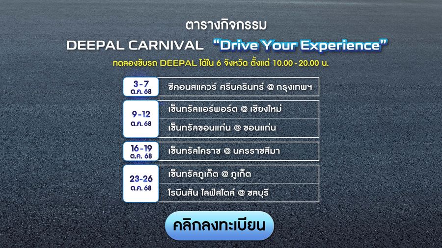 • รับฟรี คูปองอาหารจาก Food Truck — สงวนสิทธิ์สำหรับผู้ร่วมกิจกรรม Snap & Share โดยผู้เข้าร่วมต้องถ่ายภาพคู่กับรถยนต์ DEEPAL รุ่นใดก็ได้ภายในงาน และโพสต์ลงบนโซเชียลมีเดียของตนเองแบบสาธารณะ พร้อมติดแฮชแท็ก #DEEPALCarnival และ #DriveYourExperience (เฉพาะคูปองจาก food truck ที่ร่วมรายการจำกัด 1 ใบ ต่อ 1 ท่าน)