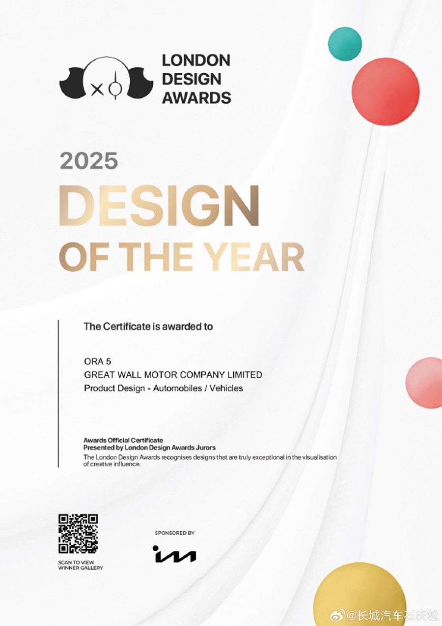 ความสำเร็จบนเวทีการออกแบบระดับนานาชาติครั้งนี้ ที่ GWM ORA 5 ก้าวขึ้นเป็นรถยนต์รุ่นแรกของโลกที่ได้รับการผลิตจริงและสามารถคว้ารางวัลสูงสุดดังกล่าว ตอกย้ำให้เห็นถึงความโดดเด่นของ ORA 5 ในฐานะรถยนต์ที่ได้รับการพัฒนาภายใต้แนวคิดการออกแบบที่ผสานความงามจากธรรมชาติเข้ากับนวัตกรรมสมัยใหม่อย่างลงตัว ไม่เพียงสร้างเอกลักษณ์ที่แตกต่าง แต่ยังยกระดับมาตรฐานการออกแบบยนตรกรรมให้ตอบโจทย์ทั้งด้านสุนทรียศาสตร์และการใช้งานในชีวิตประจำวัน สะท้อนถึงวิสัยทัศน์และศักยภาพของ GWM ในการสร้างสรรค์ยนตรกรรมที่ได้รับการยอมรับในระดับโลก พร้อมเปิดโอกาสให้ผู้สนใจชาวไทยได้ร่วมสัมผัสดีไซน์อันโดดเด่นของ GWM ORA 5 อย่างใกล้ชิด และเตรียมพบกับการเปิดตัวอย่างเป็นทางการในประเทศไทยได้ภายในเดือนมีนาคมนี้