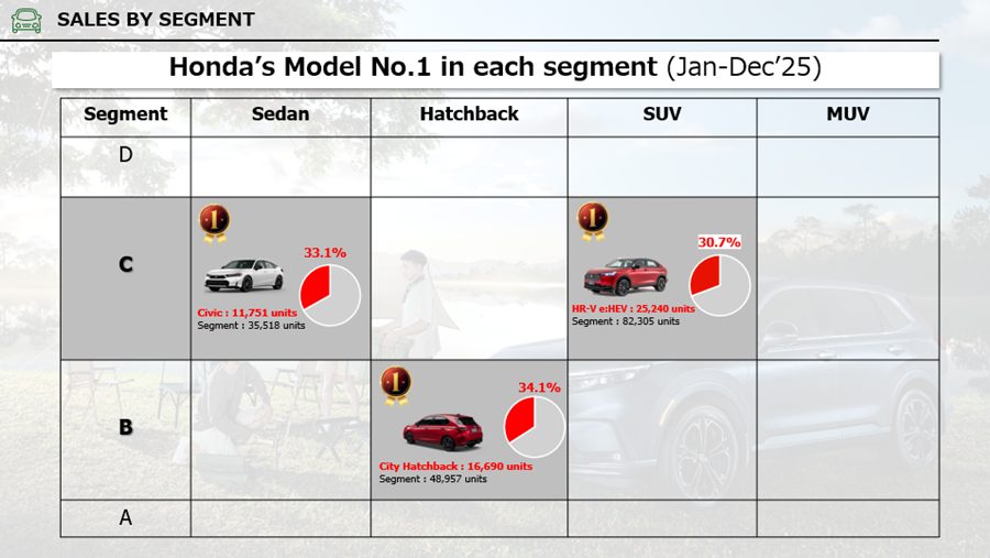 ทั้งนี้ ฮอนด้า ยังสามารถครองอันดับ 1 ใน 3 เซกเมนต์หลักของตลาดรถยนต์นั่ง ได้แก่