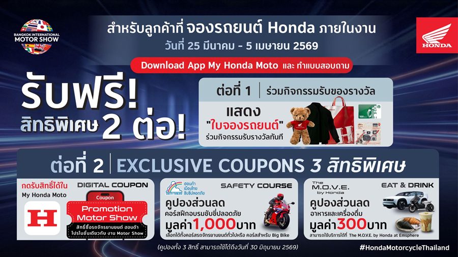 ฮอนด้า มอบข้อเสนอสุดคุ้มสำหรับลูกค้าที่จองรถยนต์ Honda ภายในงาน Motor Show 2026 เติมเต็มประสบการณ์การเดินทางในแบบ “Complete Your Honda Garage” ด้วยสิทธิพิเศษจากรถจักรยานยนต์ฮอนด้า ทั้งกิจกรรมลุ้นรับของรางวัลและคูปองสิทธิประโยชน์ รวมมูลค่าสูงสุดกว่า 1,300 บาท ระหว่างวันที่ 25 มีนาคม – 5 เมษายน 2569 ณ อาคารชาเลนเจอร์ฮอลล์ 1 อิมแพ็ค เมืองทองธานี
