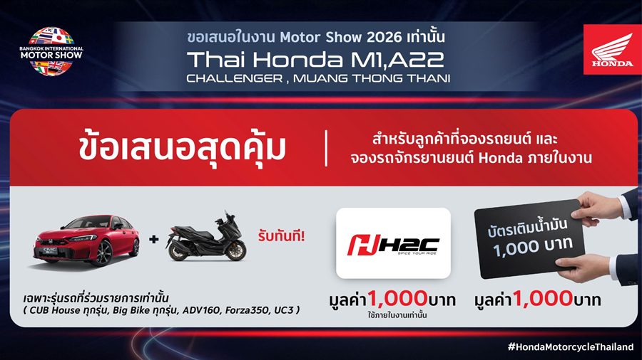 ไม่เพียงเท่านี้ ยังมีข้อเสนอสุดคุ้มสำหรับลูกค้าที่จองทั้งรถยนต์และรถจักรยานยนต์ Honda* ภายในงาน รับทันทีบัตรส่วนลด H2C มูลค่า 1,000 บาท สำหรับใช้ภายในงาน และบัตรเติมน้ำมันมูลค่า 1,000 บาท (ตามเงื่อนไขที่บริษัทฯ กำหนด)