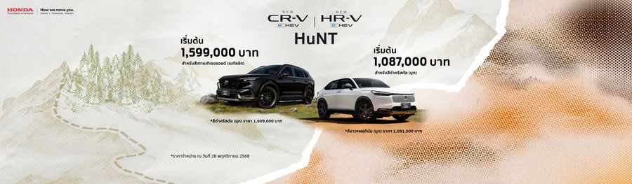 - เปิดตัวไลน์อัป HuNT Series ชุดแต่ง HuNT แพ็กเกจรอบคันที่นำเสนอในรถ SUV ยอดนิยมของฮอนด้า 2 รุ่น ได้แก่ Honda HR–V e:HEV และ Honda CR–V e:HEV ในโฉมอัปลุคพิเศษรุ่น ‘e:HEV HuNT’สะท้อนตัวตนของเหล่า HuNTSTER ผ่านสไตล์เท่ ฟังก์ชันครบ ตอบโจทย์สายลุยที่พร้อมออกค้นหาประสบการณ์ในแบบของตัวเองในทุกการเดินทาง