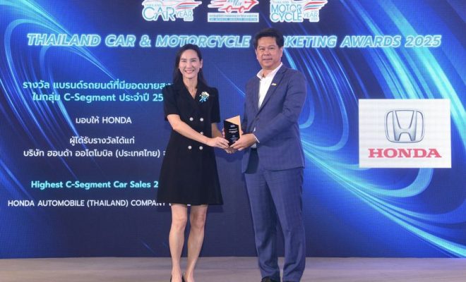 บริษัท ฮอนด้า ออโตโมบิล (ประเทศไทย) จำกัด ประกาศความสำเร็จ คว้ารางวัล “แบรนด์รถยนต์ที่มียอดขายสูงที่สุดในกลุ่ม C–Segment” ในงาน THAILAND CAR OF THE YEAR 2025 จัดโดยสมาคมผู้สื่อข่าวรถยนต์และรถจักรยานยนต์ไทย (สรยท.) สะท้อนถึงความเชื่อมั่นและการตอบรับอันดีเยี่ยมจากลูกค้าชาวไทยในรถยนต์กลุ่ม C–Segment นำโดย ฮอนด้า ซีวิค และทางสมาคมฯ นับรวมรถยนต์กลุ่ม L–SUV Segment นำโดย ฮอนด้า ซีอาร์-วี ซึ่งมียอดขายรวมทั้ง 2 รุ่น กว่า 19,000 คัน ในปีที่ผ่านมา ความสำเร็จครั้งนี้แสดงถึงวิสัยทัศน์ของฮอนด้าในการสร้างสรรค์ยนตรกรรมและยกระดับมาตรฐานยานยนต์ เพื่อส่งมอบความมั่นใจและความพึงพอใจสูงสุดให้แก่ลูกค้า