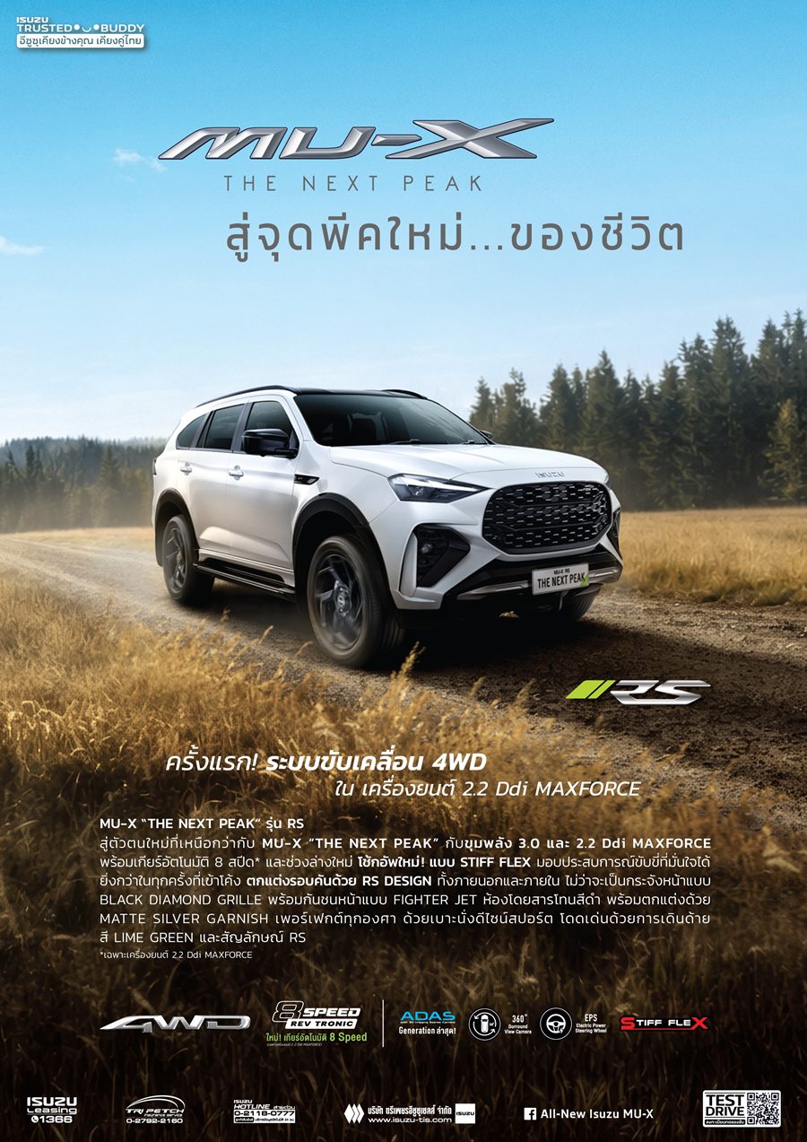 MU-X “THE NEXT PEAK” 4WD เครื่องยนต์ 2.2 Ddi MAXFORCE ในรุ่นย่อย RS และ Ultimate ในราคาเริ่มต้น 1,654,000 บาท ยกระดับสู่ตัวตนใหม่ที่เหนือกว่าในทุกด้าน ภายใต้แนวคิด “สู่จุดพีคใหม่ของชีวิต” ที่ให้สมรรถนะเร้าใจควบคู่ความประหยัดน้ำมัน ครั้งแรก! กับระบบขับเคลื่อน 4WD ในเครื่องยนต์ 2.2 Ddi MAXFORCE ที่มอบพละกำลังสูงสุด 163 แรงม้า แรงบิดสูงสุด 400 นิวตัน-เมตร