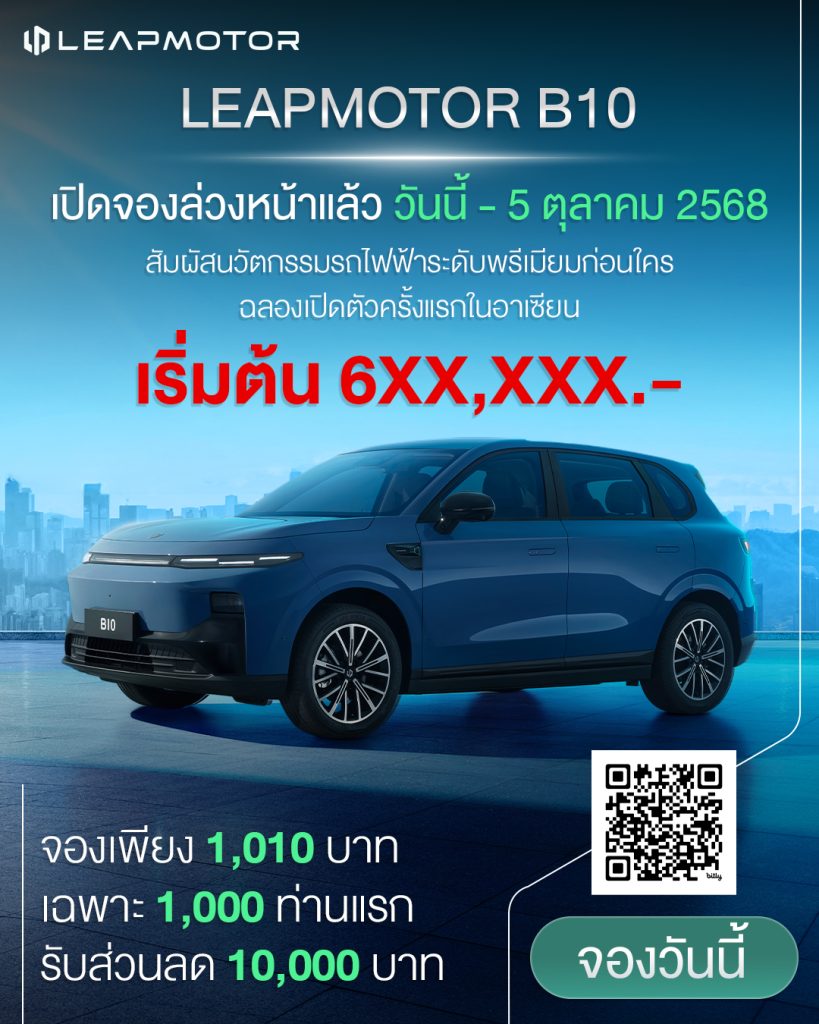 Leapmotor Thailand เปิดจองสิทธิ์ให้คุณเป็นเจ้าของรถยนต์พลังงานไฟฟ้า Leapmotor B10 รุ่นใหม่ล่าสุดที่จะเข้ามาทำตลาดรถ EV ในประเทศไทยและเป็นครั้งแรกในอาเซียน สำหรับลูกค้าที่สนใจสามารถจองสิทธิ์เป็นเจ้าของ Leapmotor B10 ได้แล้ววันนี้! เพียง 1,010 บาท จำกัดเพียง 1,000 สิทธิ์เท่านั้น พร้อมรับส่วนลดอีก 10,000 บาท ตั้งแต่วันนี้จนถึงวันที่ 5 ตุลาคมนี้ ออกรถภายในวันที่ 31 ตุลาคม 2568