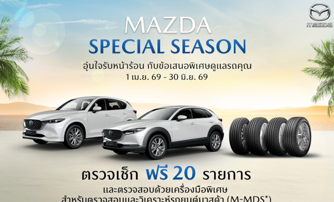 ครั้งนี้ มาสด้าจึงได้จัดแคมเปญ “MAZDA SPECIAL SEASON อุ่นใจรับหน้าร้อน กับข้อเสนอพิเศษดูแลรถคุณ” ชวนลูกค้ามาสด้า นำรถเข้ารับบริการตรวจเช็กฟรี 20 รายการ โดยตรวจสอบด้วยเครื่องมือพิเศษ สำหรับตรวจและวิเคราะห์รถยนต์มาสด้า (M-MDS*) พร้อมมอบข้อเสนอ ผ่อน 0% นานสูงสุด 6 เดือน** (เฉพาะบัตรเครดิตที่ร่วมรายการ) สำหรับลูกค้าที่ซื้อยางรถยนต์ TOYO TIRES และมอบข้อเสนอส่วนลดสูงสุด 5,000 บาท** เมื่อซื้อยางครบทุก 4 เส้น ซึ่งผู้ที่สนใจสามารถสอบถามข้อมูลเพิ่มเติมที่ศูนย์บริการมาสด้าทั่วประเทศ ตั้งแต่วันนี้ ไปจนถึงวันที่ 30 มิถุนายน 2569