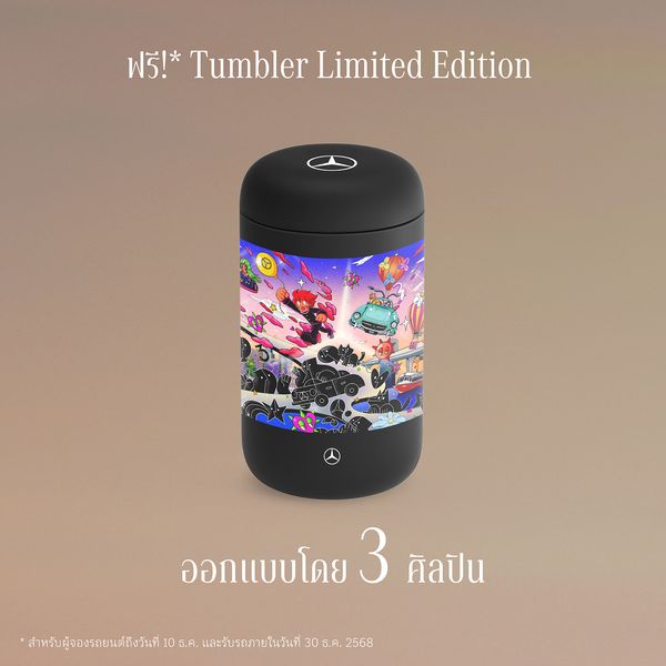 และสำหรับลูกค้าที่จองรถยนต์เมอร์เซเดส-เบนซ์ ทุกรุ่น ในงาน จะได้รับกล้อง Mercedes–Benz Drive Recorder 360° มูลค่า 16,500 บาท* และของสมนาคุณสุดพิเศษ Tumbler Limited Edition ที่ออกแบบโดยศิลปินรุ่นใหม่ทั้ง 3 ท่าน ได้แก่ “Jeff Aphisit” “Bomfha” และ “MR.HALFMAN”