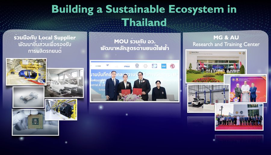 นอกจากงานบริการแล้ว เอ็มจี ยังให้ความสำคัญกับการบริหารจัดการอะไหล่ด้วยระบบสั่งด่วนภายใน 24 ชั่วโมง ซึ่งปัจจุบันมีอัตราจ่ายอะไหล่ครั้งแรกสูงถึง 99.38% ช่วยลดเวลารถค้างซ่อมและสร้างความพึงพอใจให้ลูกค้าได้อย่างเป็นรูปธรรม นอกจากนี้ เอ็มจี ยังจะให้ความร่วมมือกับหน่วยงานภายนอก โดยเฉพาะสถาบันการศึกษาชั้นนำ อาทิ มหาวิทยาลัยอัสสัมชัญ ด้วยการจัดตั้งศูนย์วิจัยยานยนต์และการเรียนรู้ยานยนต์ไฟฟ้าแบบครบวงจร ในการร่วมกันสร้างและพัฒนาบุคลากรที่มีคุณภาพเข้าสู่วงการยานยนต์ไทยอย่างต่อเนื่อง เอ็มจี เชื่อว่าความสำเร็จของแบรนด์ในระยะยาว จะเกิดจากมาตรฐานที่สม่ำเสมอทั่วประเทศ ทั้งสินค้า บริการ และระบบสนับสนุนต่าง ๆ เพื่อให้ เอ็มจี เติบโตไปพร้อมกับลูกค้าและอุตสาหกรรมยานยนต์ไทยอย่างมั่นคงและยั่งยืน”
