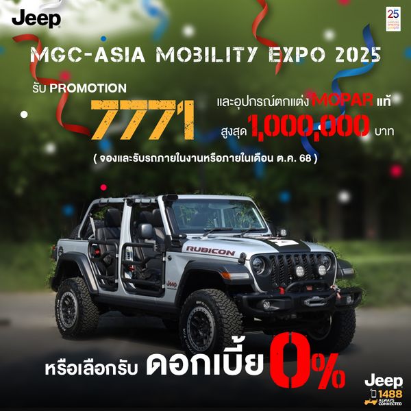 • รับโปรโมชั่น 7771 และอุปกรณ์ตกแต่ง Mopar แท้ สูงสุดมูลค่า 1,000,000 บาท* หรือดอกเบี้ย 0% พร้อมสัมผัสประสบการณ์ใหม่กับกิจกรรม Jeep Matcha Experience Brew Your Freedom*