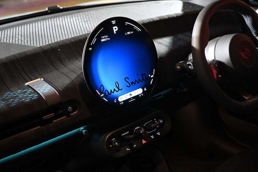 หน้าจอแสดงผลทรงกลมบริเวณกลางคอนโซล มาพร้อมภาพแบ็คกราวด์ลายพอล สมิธ ให้เลือกใช้ได้ 3 ภาพในโหมด Personal และเมื่อเปิดประตูรถ ผู้ขับขี่และผู้โดยสารเบาะหน้าจะได้รับการต้อนรับด้วยไฟโปรเจกเตอร์ที่ฉายคำว่า ‘Hello’ ในรูปแบบลายมือลงที่พื้น ส่วนกรอบประตูรถด้านล่างก็ยังตกแต่งด้วยข้อความ ‘Every day is a new beginning’ ซึ่งเป็นคติประจำใจของพอล สมิธ ขณะที่พรมปูพื้นในห้องโดยสารมาพร้อมกับกราฟิกรูปกระต่าย จากฝีมือการวาดของเซอร์ พอล สมิธ อีกด้วย