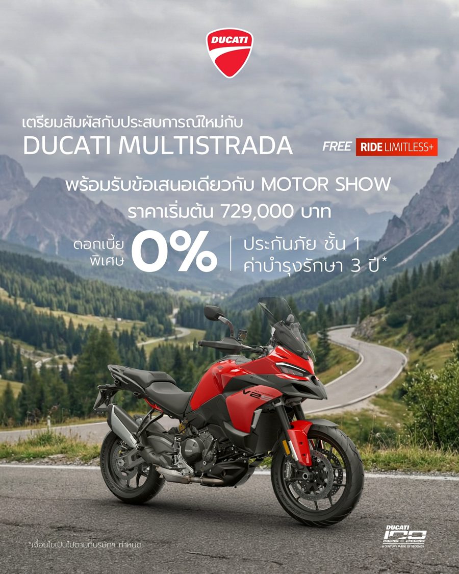 ผู้ที่สนใจสามารถสัมผัสรถ Ducati ครบทุก Model Range พร้อมทดลองนั่งและรับคำแนะนำจากผู้เชี่ยวชาญ รวมถึงจองรถและรับข้อเสนอพิเศษได้ที่บูธ ดูคาติ ประเทศไทย ภายในงาน Bangkok International Motor Show 2026 ณ อาคารชาเลนเจอร์ อิมแพ็ค เมืองทองธานี ระหว่างวันที่ 25 มีนาคม – 5 เมษายน 2569 หรือสอบถามข้อมูลเพิ่มเติมได้ที่โชว์รูม Ducati ทุกสาขาทั่วประเทศ รวมถึงช่องทางออนไลน์ เว็บไซต์: www.ducati.com/th Facebook: Ducati Thailand LINE Official: @ducatithailand