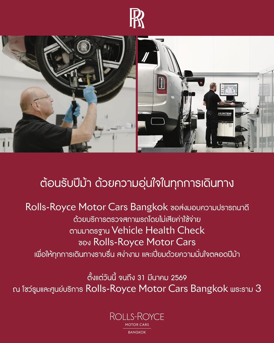 นอกจากนี้ โรลส์-รอยซ์ มอเตอร์ คาร์ส แบงคอก ขอส่งมอบความอุ่นใจ ห่วงใยในทุกการเดินทาง ด้วยบริการตรวจสภาพรถตามมาตรฐาน Vehicle Health Check ของ โรลส์-รอยซ์ มอเตอร์ คาร์ส โดยไม่คิดค่าใช้จ่าย เพื่อให้ทุกเส้นทางของท่านราบรื่น สง่างาม เปี่ยมด้วยความมั่นใจ พร้อมขอเชิญลูกค้าที่นำรถเข้ามารับบริการ สมัครเป็นสมาชิก Whispers เพื่อรับสิทธิประโยชน์หลากหลายรวมถึงประสบการณ์ที่หรูหราเหนือระดับ ตั้งแต่วันนี้ถึง 31 มีนาคม 2569 ที่โชว์รูมและศูนย์บริการ โรลส์-รอยซ์ มอเตอร์ คาร์ส แบงคอก พระราม 3