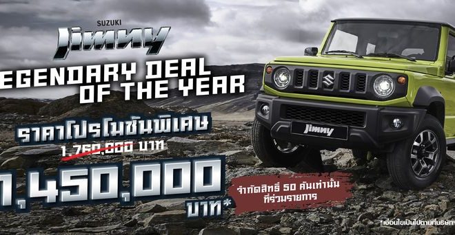 บริษัท ซูซูกิ มอเตอร์ (ประเทศไทย) จำกัด ประกาศแคมเปญสุดพิเศษ “Legendary Deal of the Year” ฉลองยอดขาย SUZUKI JIMNY ในประเทศไทยนับตั้งแต่เปิดตัวทะลุ 220 คัน เพื่อขอบคุณลูกค้าที่ให้การตอบรับอย่างดี จนทำให้ SUZUKI JIMNY กลายเป็นรถยนต์ออฟโรดไอคอนิกที่ประสบความสำเร็จอย่างต่อเนื่องในตลาด