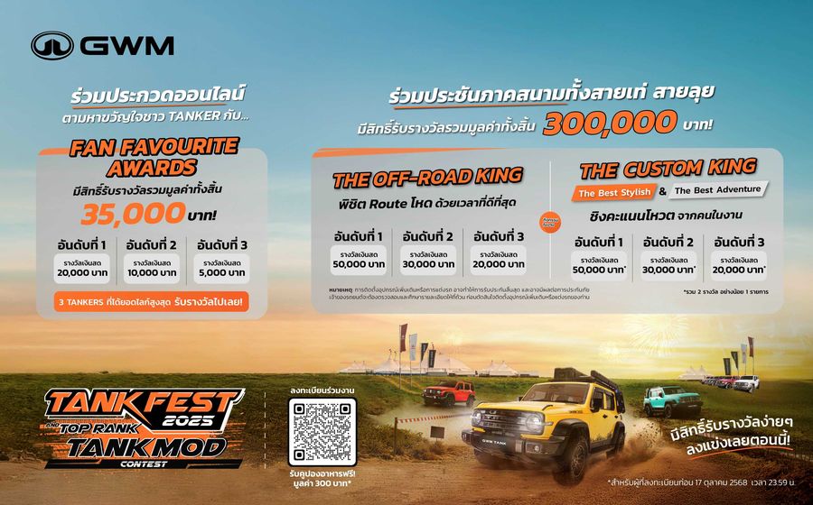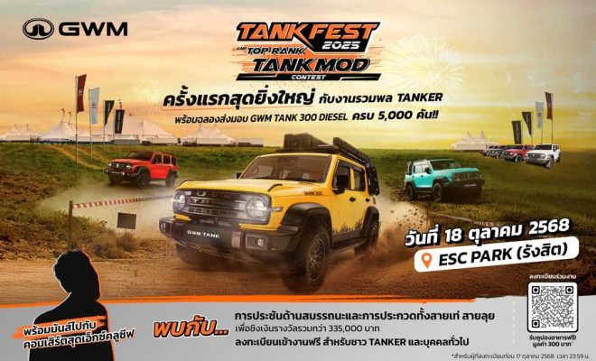 GWM จึงจัดมหกรรมเฟสติวัลสุดยิ่งใหญ่ “TANK FEST 2025 and TOP RANK TANK MOD” ครั้งแรกในไทย เนรมิตพื้นที่ขนาดมหึมาเกือบ 50,000 ตารางเมตร ให้เป็นลานกิจกรรมสุดเร้าใจ เปิดพื้นที่สำหรับแฟนพันธุ์แท้ GWM TANK ทั้งสายออฟโรดและสายชิลล์ผู้ที่ชื่นชอบการแต่งรถให้เป็นพื้นที่ได้ปล่อยของ ปลดปล่อยจินตนาการ และความคิดสร้างสรรค์ได้อย่างไร้ขีดจำกัด ผ่านกิจกรรมความสนุกที่อัดแน่นในทุกตารางนิ้ว ทั้งเวทีประกวดและจัดแสดงรถแต่ง การแข่งขันการขับขี่ออฟโรดสุดครีเอทีฟ สนามเทสต์สมรรถนะ GWM TANK กิจกรรมความสนุกอีกมากมาย พร้อมรับของที่ระลึกติดไม้ติดมือกลับบ้าน การันตีความอร่อยตลอดวันด้วยสตรีทฟู้ดกับ Food truck เจ้าดังจำนวนมาก รับชมการแสดงดนตรีคลอเคล้าบรรยากาศจากวงดนตรีชื่อดังตั้งแต่เช้าจรดเย็น พร้อมตบท้ายด้วยคอนเสิร์ตจากศิลปินชื่อดังยามค่ำคืน สำหรับผู้ที่สนใจทุกคนเข้าร่วมงานฟรีแบบไม่มีค่าใช้จ่าย จะมาคนเดียว มาเป็นคู่ เป็นแก๊งค์ หรือยกขบวนทั้งครอบครัว ปักหมุดแล้วมาเจอกัน วันเสาร์ที่ 18 ตุลาคม 2568 ณ ESC Park รังสิต จ.ปทุมธานี และวันอาทิตย์ที่ 19 ตุลาคม 2568 สำหรับผู้ที่สนใจทดลองขับ GWM