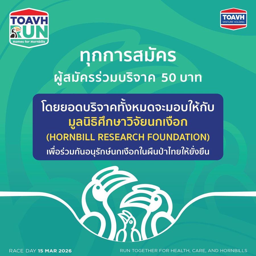 TOAVH ขอเชิญชวนประชาชน นักวิ่ง และผู้รักธรรมชาติทุกท่าน ร่วมเป็นส่วนหนึ่งในการอนุรักษ์นกเงือก และฟื้นฟูฝืนป่าไทย ด้วยการสมัครเข้าร่วมกิจกรรมวิ่งการกุศล  “TOAVH RUN X Homes for Hornbills” ในวันอาทิตย์ที่ 15 มีนาคม 2569 ณ สวนหลวง ร.9 – บึงหนองบอน ผ่านช่องทางออนไลน์ https://race.thai.run/toavhrun2026  เปิดรับสมัครแล้วตั้งแต่วันนี้เป็นต้นไป