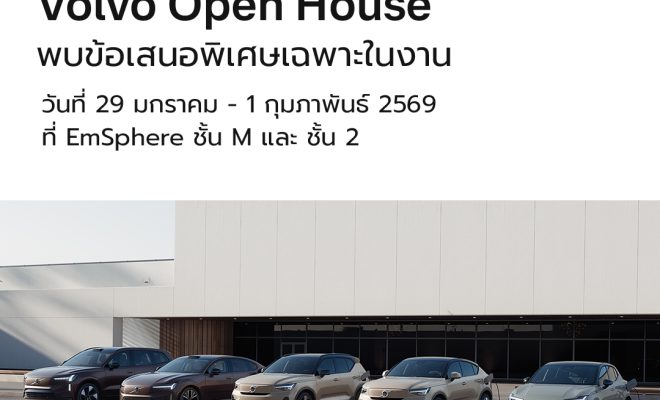 กลับมาอีกครั้งกับงาน Volvo Open House งานสุดพิเศษที่เปิดโอกาสให้ผู้สนใจเป็นเจ้าของรถวอลโว่ได้ง่ายยิ่งขึ้น พร้อมข้อเสนอสุดเอ็กซ์คลูซีฟ ครอบคลุมทั้งรถใหม่ ไม่ว่าจะเป็นรถไฟฟ้าเต็มรูปแบบ และรถปลั๊กอินไฮบริด รวมถึงรถ Volvo Selekt Certified used cars ทั้งรถผู้บริหาร รถทดลองขับ และรถป้ายแดงเลขไมล์น้อย ที่ผ่านการรับรองคุณภาพตามมาตรฐานของวอลโว่ คาร์ ประเทศไทย ให้เลือกสรรอย่างครบครันในที่เดียว งานจัดขึ้นระหว่างวันที่ 29 มกราคม – 1 กุมภาพันธ์ พ.ศ. 2569 ตั้งแต่เวลา 10.00 – 20.00 น. ณ ศูนย์การค้า The EmSphere บริเวณชั้น M และชั้น 2