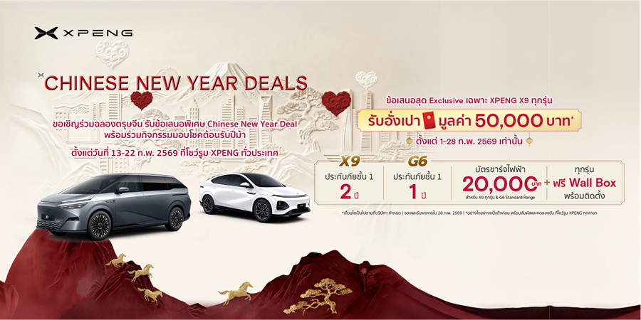สัมผัสและทดลองขับ เอ็กซ์เผิง พร้อมร่วมกิจกรรมเสริมมงคลรับตรุษจีน ‘XPENG Chinese New Year Deal’ ระหว่างวันที่ 13-22 กุมภาพันธ์ 2569 ที่โชว์รูม เอ็กซ์เผิง ทุกสาขาทั่วประเทศ