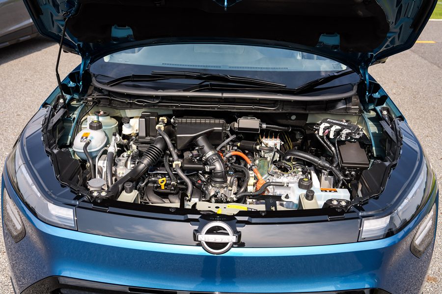 เทคโนโลยี อี-พาวเวอร์ ของนิสสันผสานมอเตอร์ไฟฟ้าและอินเวอร์เตอร์ไว้ในชุดเดียว มาพร้อมเครื่องยนต์ 1.2 ลิตร 3 สูบ DOHC 12 วาล์วซึ่งรองรับน้ำมันหลากหลายรวมถึง E20 ให้กำลัง 136 แรงม้า และแรงบิดสูงสุด 280 นิวตันเมตร มาพร้อมแบตเตอรี่ลิเธียม-ไอออน 2.06 kWh ให้การเร่งที่นุ่มนวล ตอบสนองทันใจ เครื่องเดินเงียบ และให้ความรู้สึกขับขี่แบบรถไฟฟ้าเต็มรูปแบบ โดยไม่ต้องชาร์จไฟจากภายนอกหรือเปลี่ยนพฤติกรรมการขับขี่ ระบบ อี-เพดัล สเต็ป (e-Pedal Step) ที่มาพร้อมกับเครื่องยนต์ อี-พาวเวอร์ ของนิสสันช่วยเพิ่มความสนุกในการขับขี่ โดยผู้ขับสามารถเร่งและชะลอความเร็วได้ด้วยแป้นคันเร่งเพียงแป้นเดียว ช่วยให้ควบคุมระยะห่าง เข้าโค้ง ลงทางลาด หรือผ่านลูกระนาดได้อย่างมั่นใจ รวมทั้งยังช่วยชาร์จพลังงานกลับเข้าสู่แบตเตอรี่ (Regenerative Braking) ระหว่างการชะลอความเร็ว