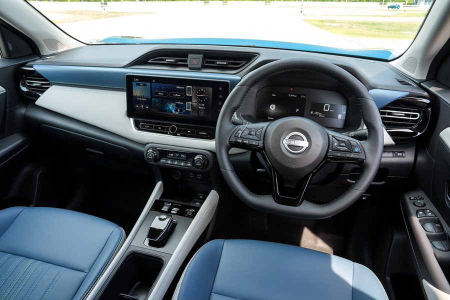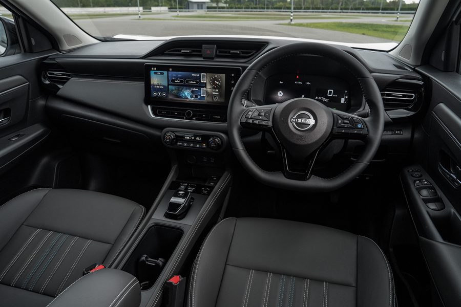 ห้องโดยสารดีไซน์ใหม่ ซึ่งไม่เพียงให้บรรยากาศทันสมัย แต่ยังช่วยให้ใช้งานได้ง่าย จุดเด่นภายในตัวรถ อยู่ที่ Audio Display หน้าจอแสดงผลดิจิทัลความละเอียดสูงขนาด 12.3 นิ้ว และ หน้าจอ TFT ขนาด 7 นิ้ว พร้อมมาตรวัดความเร็วดิจิทัล เพิ่มความทันสมัย อ่านข้อมูลสำคัญได้สะดวก รวดเร็ว และชัดเจน พร้อมทั้งจัดการระบบอินโฟเทนเมนต์ NissanConnect ได้ง่ายดายเพื่อการเชื่อมต่อที่ราบรื่นแบบไร้สายกับ Apple CarPlay และ Android Auto หรือเชื่อมต่อผ่านสาย USB หรือบลูทูธได้สะดวก นอกจากนี้ ผู้ขับขี่ยังสามารถใช้แอป เลือกเพลง และระบบนำทางได้อย่างสะดวกในทุกเส้นทาง รวมทั้งยังมีที่ชาร์จไร้สาย เพื่อให้สามารถเชื่อมต่อได้ตลอดการเดินทาง ห้องโดยสารได้รับการปรับดีไซน์ใหม่ตั้งแต่แผงคอนโซลหน้า คอนโซลกลาง ไปจนถึงแผงประตู และช่องแอร์ ทั้งหมดช่วยให้บรรยากาศภายในดูเป็นระเบียบ และใช้งานได้ง่ายขึ้นในทุกจุด พร้อมพวงมาลัยหุ้มหนังที่มีในทุกรุ่นย่อย เสริมประสบการณ์ใช้งานที่ดีขึ้น