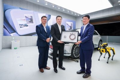 นายเจ กิว จอง ประธานเจ้าหน้าที่บริหาร บริษัท ฮุนได โมบิลิตี้ (ประเทศไทย) จำกัด (ซ้าย) พร้อมด้วย นายยัง ตัก ลี รองประธาน บริษัท ฮุนได มอเตอร์ จำกัด (ขวา) มอบของที่ระลึกให้กับ นายสุภกิต เจียรวนนท์ -