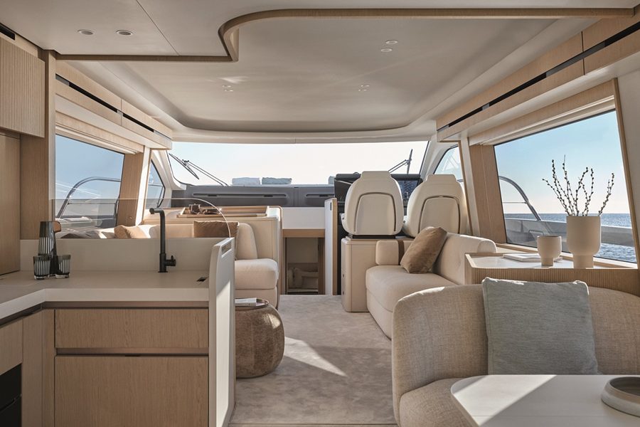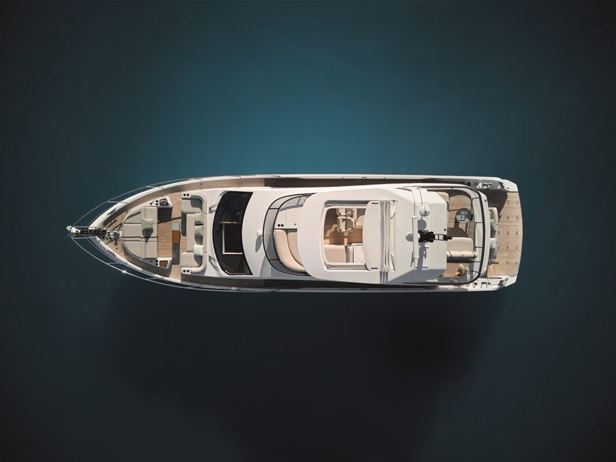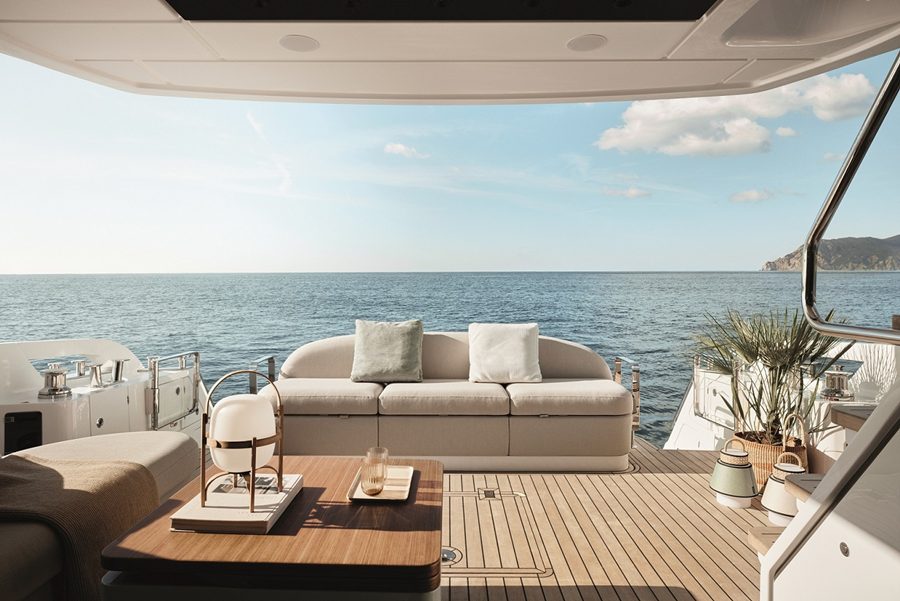 ในส่วนของพื้นที่ท้ายเรือเปิดออก พร้อมโซฟาปรับระดับ ลดทอนขอบเขตทางกายภาพ สร้างพื้นที่พักผ่อนและอาบแดดขนาดใหญ่ใกล้ผืนน้ำ ขับเคลื่อนด้วยเครื่องยนต์ Twin Volvo Penta IPS 1200 (900 แรงม้า) หรือ IPS 1350 (1000 แรงม้า) ประสิทธิภาพการใช้เชื้อเพลิงดีกว่าระบบเพลาแบบดั้งเดิมสูงสุดถึง 25% ความเร็วสูงสุดประมาณ 32 นอทส์ และความเร็วเดินทางที่นุ่มนวลและมั่นคงที่ 26 นอทส์ มาพร้อมพื้นที่ Sky Lounge Flybridge ขนาดใหญ่ รองรับการพักผ่อนและสังสรรค์ระดับพรีเมียม