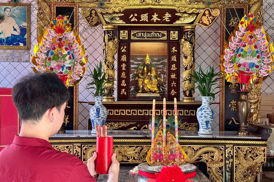 จากนั้นเดินทางต่อสู่ ศาลเจ้ากวนอู ย่านคลองสานที่กำลังเป็นกระแสด้วยการขับเคลื่อนของร้านเก๋ ร้านดัง ทั้งร้านอาหาร คาเฟ่ ร้านจำหน่ายของที่ระลึกมากมาย โดยศาลเจ้าเก่าแก่ที่ก่อตั้งมาตั้งแต่สมัยกรุงศรีอยุธยาตอนปลาย และได้รับการยอมรับว่าเป็นศาลเจ้ากวนอูที่เก่าแก่ที่สุดในประเทศไทย กว่า 290 ปี เทพกวนอู หรือ “อากง” ของชุมชน เป็นสัญลักษณ์แห่งคุณธรรม ความซื่อสัตย์ และความสำเร็จด้านการค้า ผู้ศรัทธานิยมไหว้ขอพรด้านการงาน การค้าขาย เงินทอง และความก้าวหน้าในชีวิต สำหรับการสักการะตามแนวปฏิบัติที่ใช้ ธูป 11 ดอก และเทียน 1 คู่ โดยเริ่มกราบไหว้ เทวดาฟ้าดิน ด้วยธูป 5 ดอก จากนั้นไหว้องค์เทพกวนอู ด้วยธูป 3 ดอก และไหว้พระโพธิสัตว์กวนอิม ด้วยธูปอีก 3 ดอก ก่อนปิดท้ายด้วยพิธี จับเท้าขอพรเทพกวนอู ซึ่งเป็นเอกลักษณ์ของศาลเจ้าแห่งนี้ ซึ่งศักดิ์สิทธิ์ทั้งด้านการงาน การเงิน การเรียน รวมถึงเรื่องการซื้อขายที่ดิน ทั้งนี้ เส้นทางเข้าสู่ศาลเจ้าต้องลัดเลาะผ่านชุมชนวัดอนงค์ ใกล้สวนสมเด็จพระศรีนครินทร์ริมแม่น้ำเจ้าพระยา ช่วยถ่ายทอดบรรยากาศของชุมชนดั้งเดิมที่อบอวลด้วยความศรัทธา และเติมความอิ่มใจให้กับทริปตรุษจีนตลอดการเดินทาง
