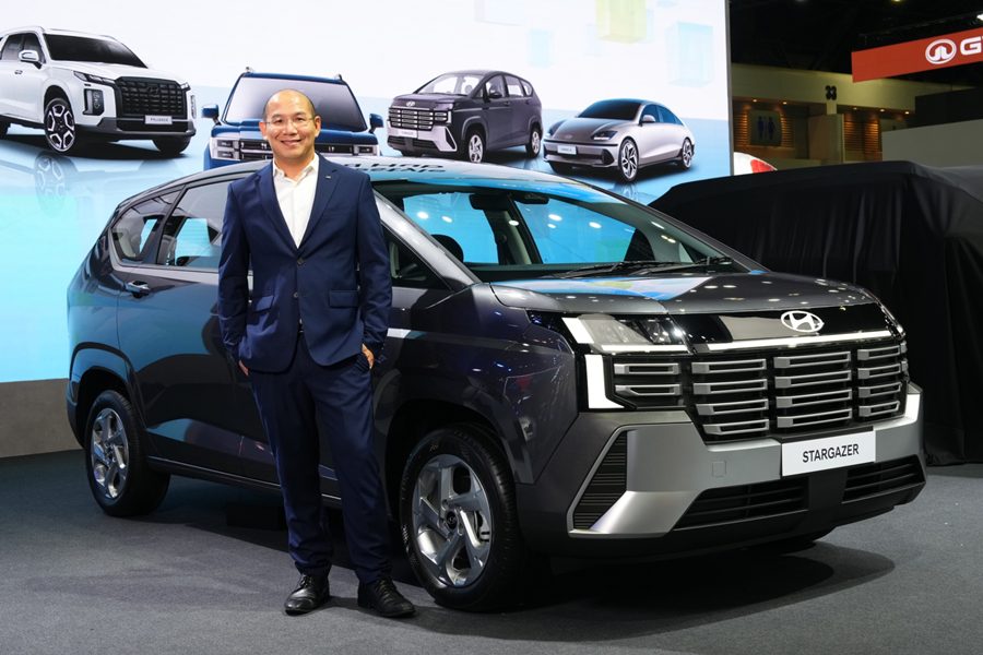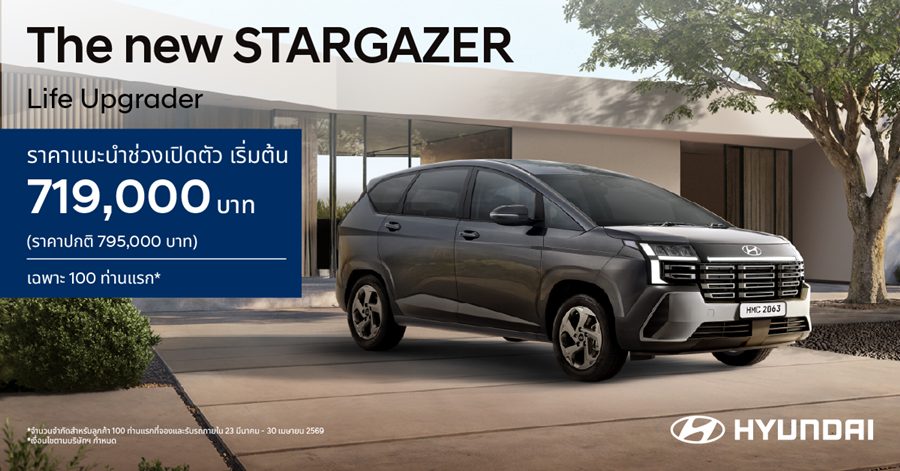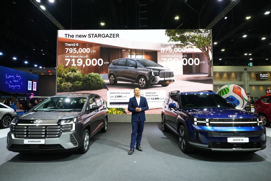 ขณะเดียวกัน ฮุนไดยังเปิดตัว Hyundai new STARGAZER รถยนต์ 6 ที่นั่ง 3 แถว รุ่นปรับโฉมใหม่ รถอเนกประสงค์ที่ออปชันความปลอดภัยครบสุดในคลาสด้วย Hyundai SmartSense มากถึง 13 ระบบ พัฒนาภายใต้แนวคิด “Life Upgrader” อัปชีวิตให้เหนือกว่า เพื่อตอบโจทย์ไลฟ์สไตล์ของผู้ใช้งานยุคใหม่ ทั้งครอบครัวรุ่นใหม่ สตาร์ตอัปยุคใหม่ และผู้ที่ต้องการรถยนต์ที่รองรับการใช้งานได้หลากหลายในคันเดียว ตัวรถได้รับการออกแบบใหม่ทั้งหมด ให้ภาพลักษณ์แข็งแกร่ง ทันสมัย และมีบุคลิกแบบ SUV มากยิ่งขึ้น โดยตัวถังมีความยาวเพิ่มขึ้น 115 มิลลิเมตร ช่วยให้สัดส่วนโดยรวมดูใหญ่และทรงพลังขึ้น พร้อมไฟหน้า ไฟท้าย แบบ LED และไฟ Daytime Running แบบ Integrated ที่ช่วยเพิ่มความโดดเด่นบนท้องถนน ด้านสมรรถนะ Hyundai new STARGAZER ขับเคลื่อนด้วยเครื่องยนต์ 1.5 MPi ให้กำลังสูงสุด 113 แรงม้า และแรงบิด 144 นิวตันเมตร จับคู่เกียร์ IVT (Intelligent Variable Transmission) ที่ให้การขับขี่นุ่มนวลและตอบสนองดีในชีวิตประจำวัน พร้อมมอบอัตราการประหยัดน้ำมันสูงสุด 17.24 กม./ลิตร*** และพัฒนาระบบ NVH เพื่อลดเสียงรบกวนและแรงสั่นสะเทือน เพิ่มความเงียบและความสบายภายในห้องโดยสาร อีกทั้งยังมาพร้อมเทคโนโลยีความปลอดภัย Hyundai SmartSense (ADAS) มากถึง 13 ระบบ ซึ่งถือว่าครบครันที่สุดในเซกเมนต์ เช่น ระบบควบคุมความเร็วอัตโนมัติแบบแปรผัน (SCC) พร้อม Stop & Go, ระบบช่วยเตือนและเบรกฉุกเฉินอัตโนมัติที่ทางแยก (FCA-JT), ระบบเตือนและเบรกอัตโนมัติขณะถอยรถ (RCCA), ระบบช่วยควบคุมรถให้อยู่ในเลน (LKA) เพื่อเพิ่มความมั่นใจในทุกการเดินทาง โดยเปิดตัว 2 รุ่นย่อย ประกอบด้วย รุ่น Trend 6 และ Smart 6