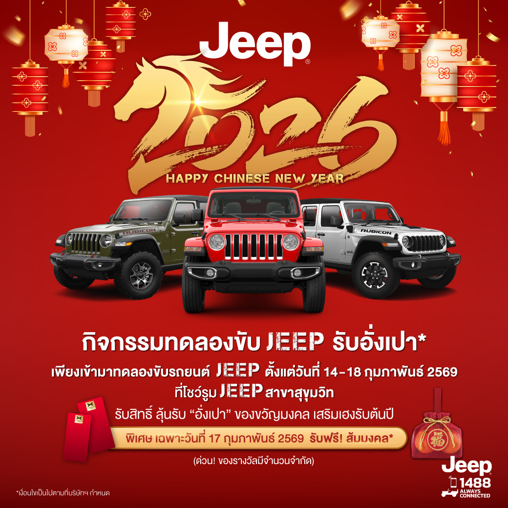 สัมผัสและทดลองขับ ยนตรกรรมพันธุ์แกร่งสัญชาติอเมริกัน มาพร้อมขุมพลังที่สามารถทำได้ทุกสิ่ง ไปได้ทุกที่ ในงาน ‘Golden Harmony: Love, Prosperity & Future Mobility’ ระหว่างวันที่ 14-18 กุมภาพันธ์ 2569 ที่โชว์รูมพร้อมศูนย์บริการครบวงจร จี๊ป ไลอ้อน ออโต้โมบิล สุขุมวิท