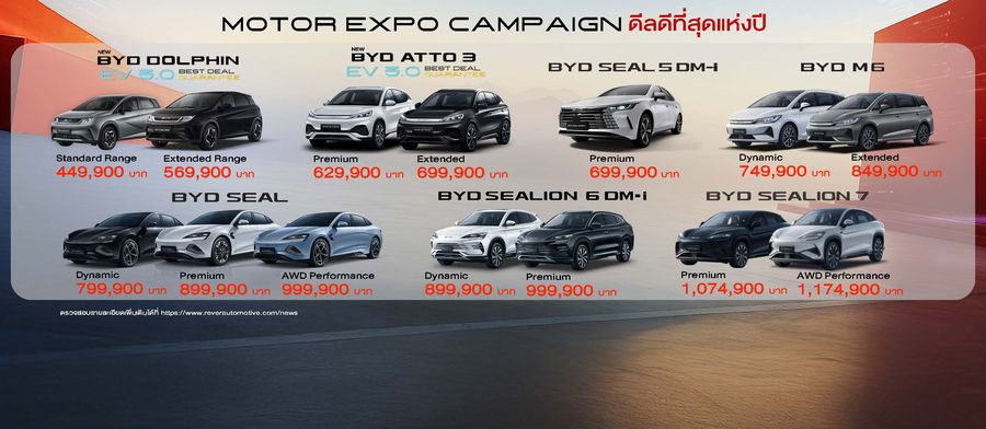บริษัท เรเว่ ออโตโมทีฟ จำกัด ภายใต้ กลุ่มธุรกิจเรเว่ ผู้จัดจำหน่ายและให้บริการหลังการขายรถยนต์พลังงานใหม่ บีวายดี และ เดนซ่า อย่างเป็นทางการในประเทศไทย ประกาศความสำเร็จจากงาน มหกรรมยานยนต์ ครั้งที่ 42 หรือ มอเตอร์ เอ็กซ์โป 2025 หลังกวาดยอดจองรวมในงานท่วมท้นเป็นจำนวน 10,533 คัน แบ่งเป็น บีวายดี 10,031 คัน และ เดนซ่า 502 คัน ขึ้นเป็นแบรนด์รถยนต์พลังงานใหม่ที่มียอดจองสูงเป็นอันดับ 1 ของงาน