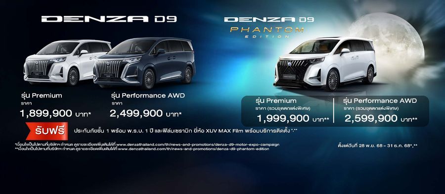 • DENZA D9 Phantom Edition ราคาพิเศษ 1,999,900 บาท1 ในรุ่น Premium หรือ 2,599,900 บาท1 ในรุ่น AWD Performance