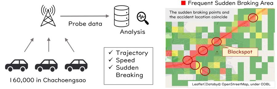 ด้าน TMF มุ่งมั่นในการค้นหาแนวทางใหม่ๆ เพื่อปรับปรุงความปลอดภัยบนท้องถนนโดยใช้ข้อมูลและ เทคโนโลยีขั้นสูง ร่วมกับสถาบันเทคโนโลยีแห่งเอเชีย โดย TMF ได้ดำเนินโครงการระยะที่ 1 ในจังหวัดฉะเชิงเทรา โดยใช้ข้อมูลจากรถยนต์โตโยต้าที่ติดตั้งระบบเก็บข้อมูลการขับขี่ ทั้งนี้ ข้อมูลเชิงลึก และมาตรการแก้ไขที่ได้จากเฟสแรกจะถูกนำไปพัฒนาเพิ่มเติมร่วมกับชุดข้อมูลและเทคโนโลยีอื่นๆ ในโครงการระยะที่ 2 ซึ่งกำลังดำเนินการอยู่ในเขตจตุจักร กรุงเทพมหานคร